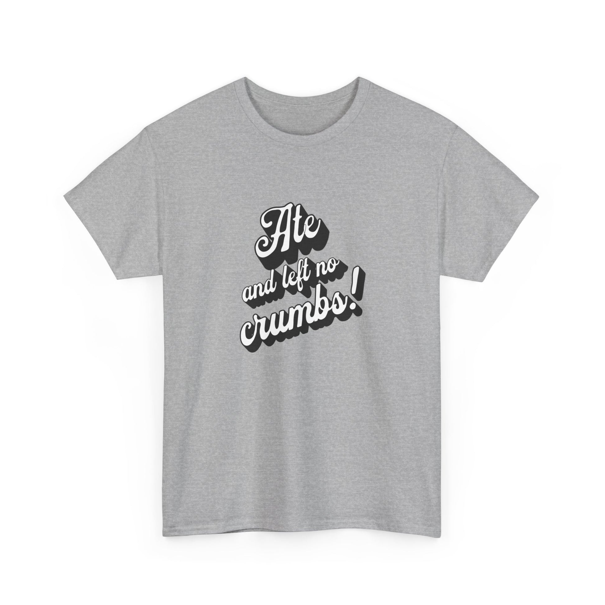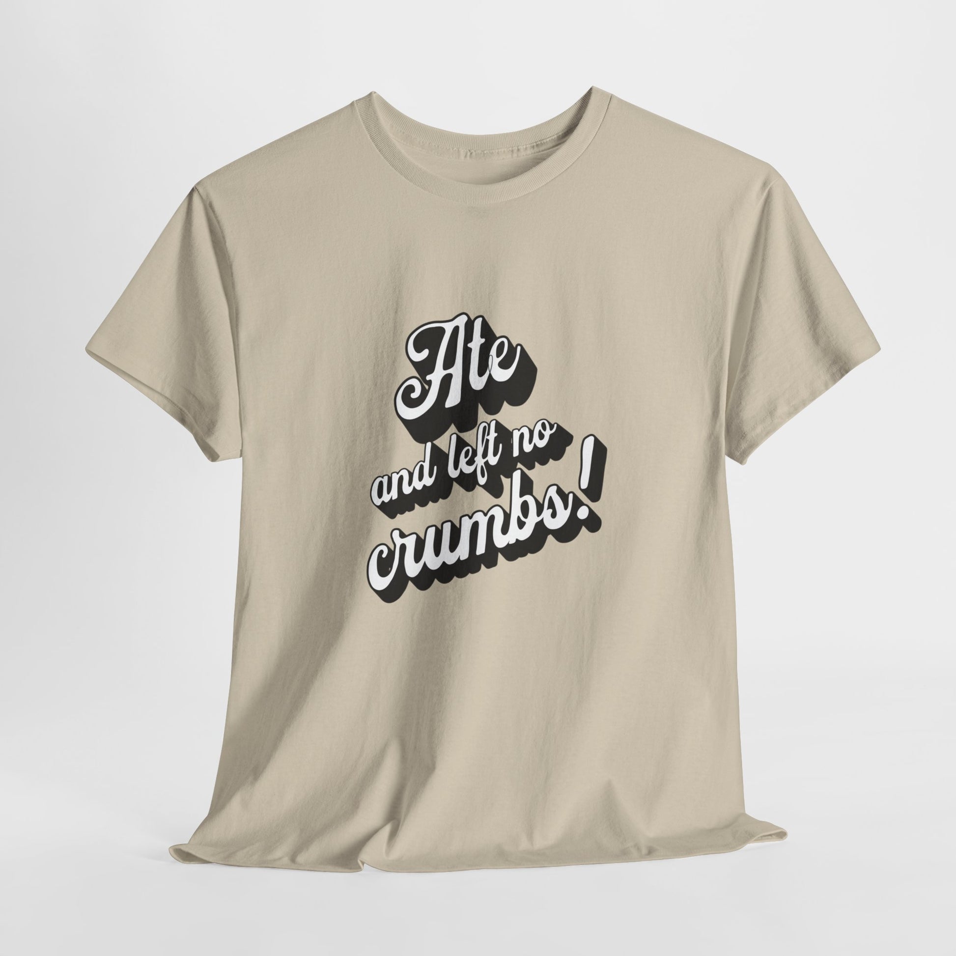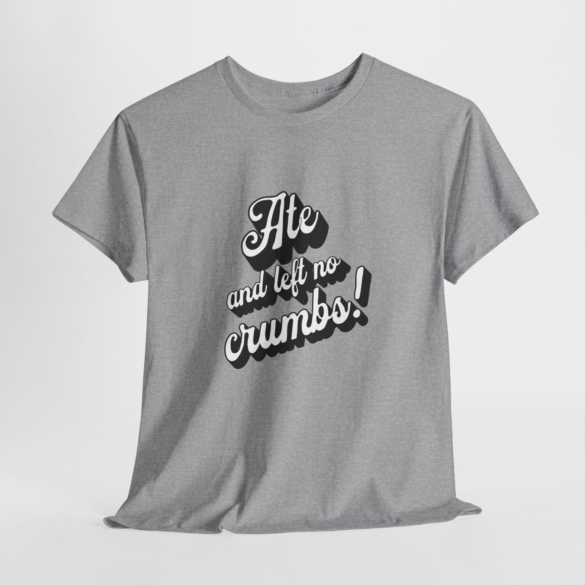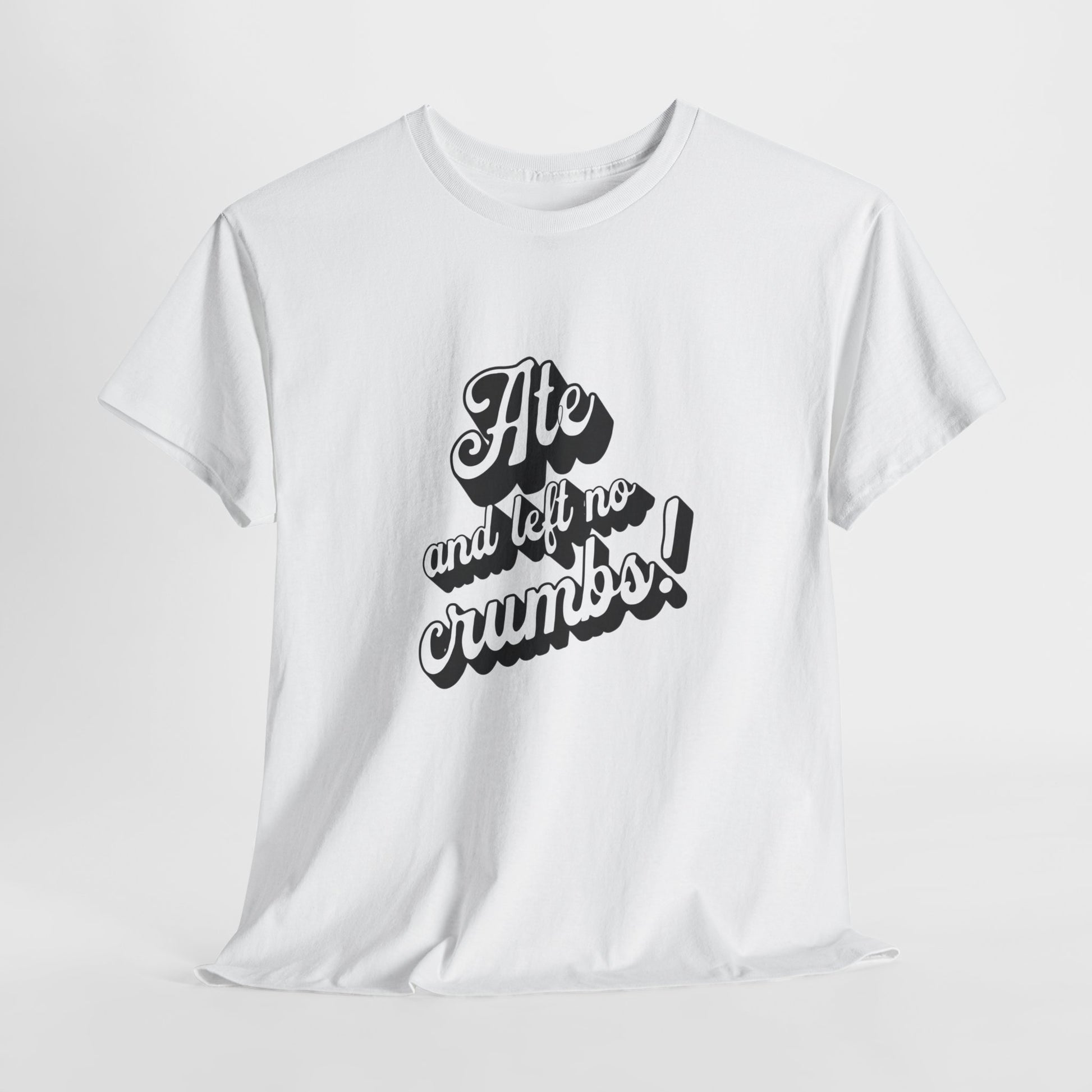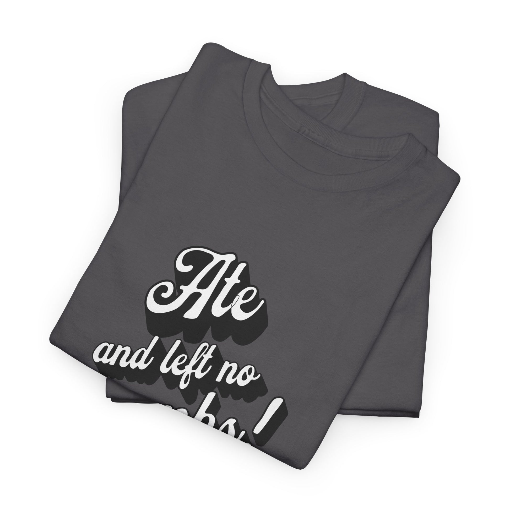 This 'Ate And Left No Crumbs' tee exudes a playful and carefree vibe, perfect for those who love quirky humor. It's ideal for casual wear and can be styled for everyday occasions. This tee is relevant for food lovers, humor enthusiasts, and those looking for a fun conversation starter. Perfect for gifts during birthdays, holidays, or just to add a touch of humor to someone's wardrobe.