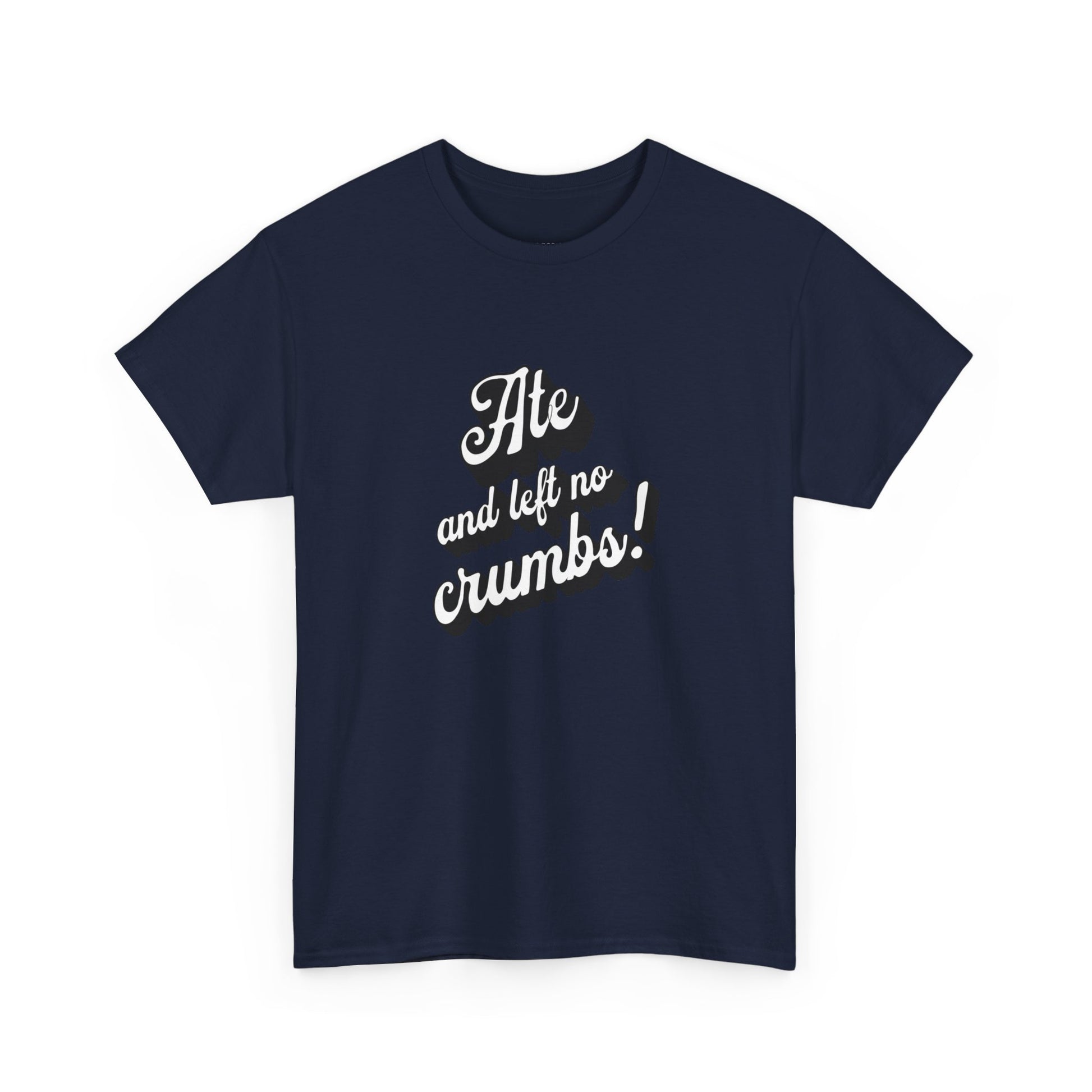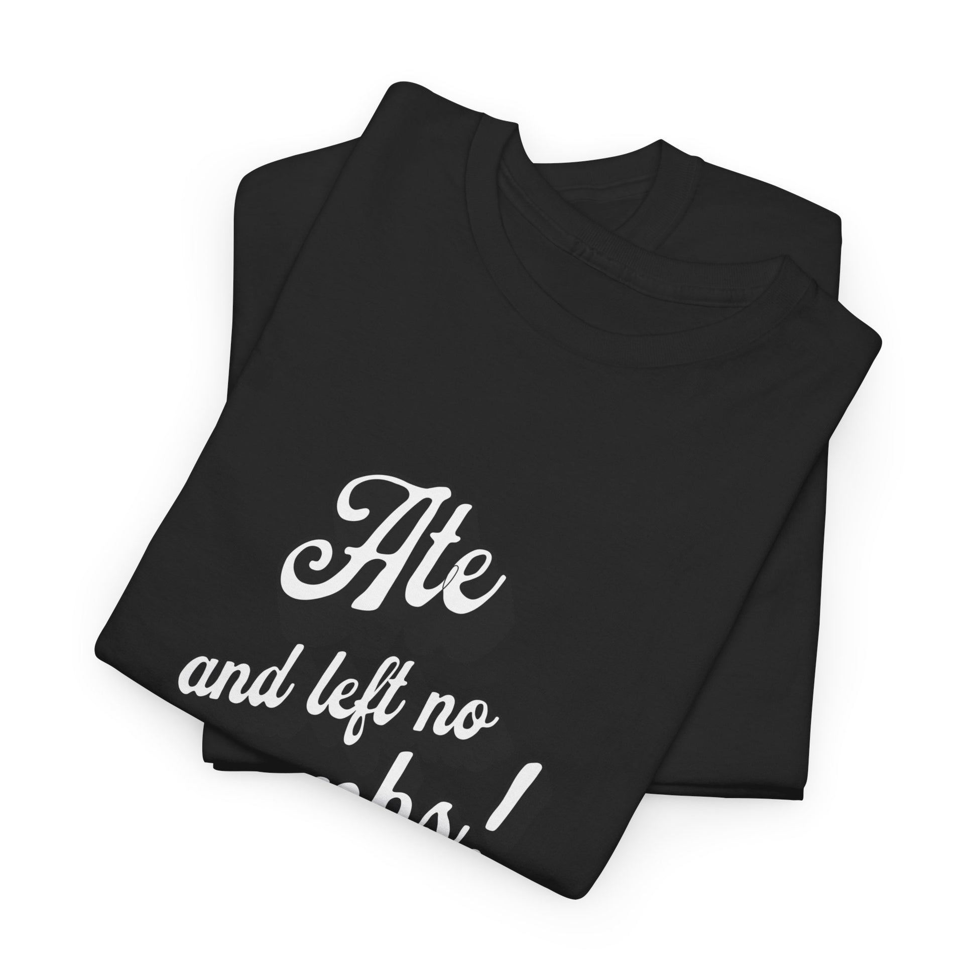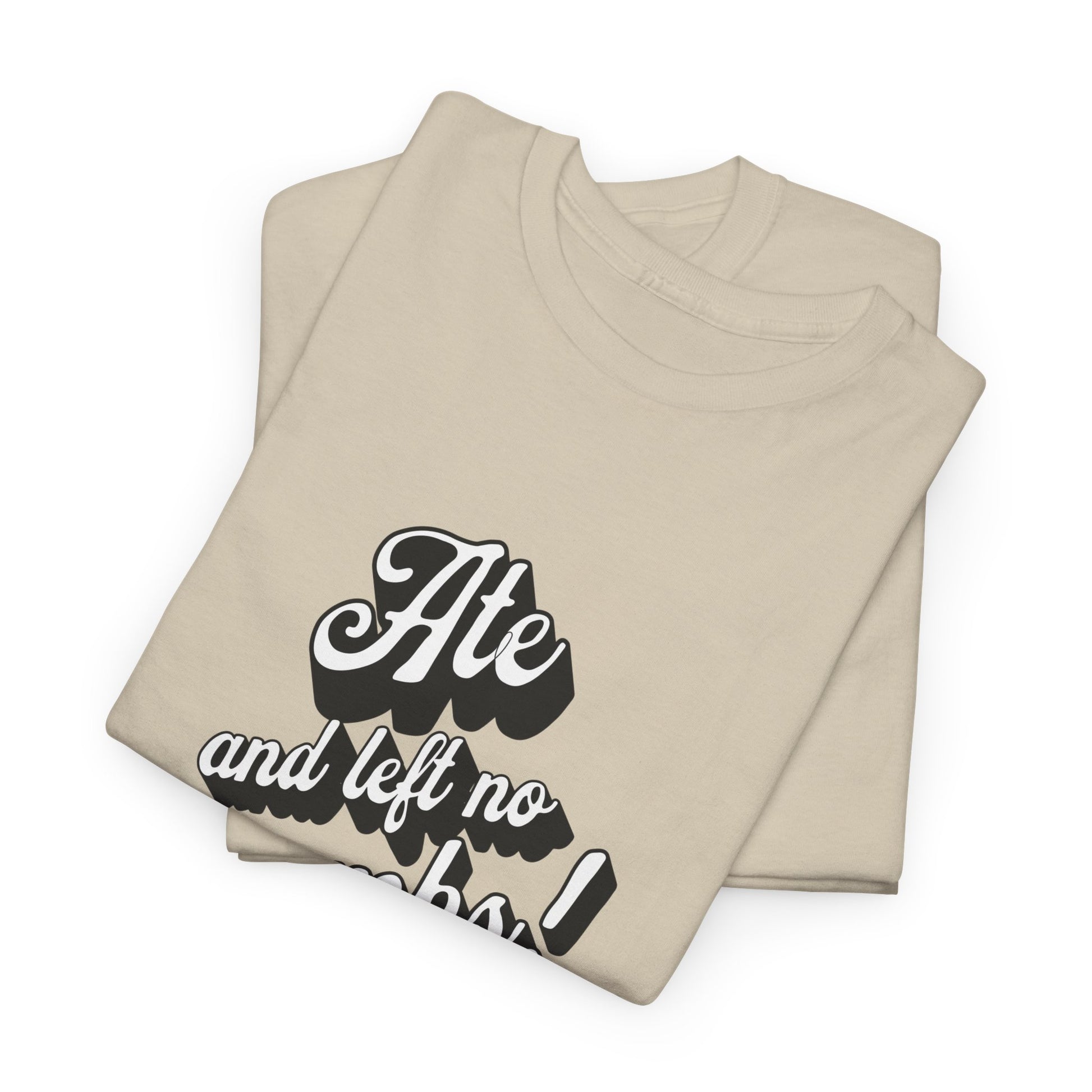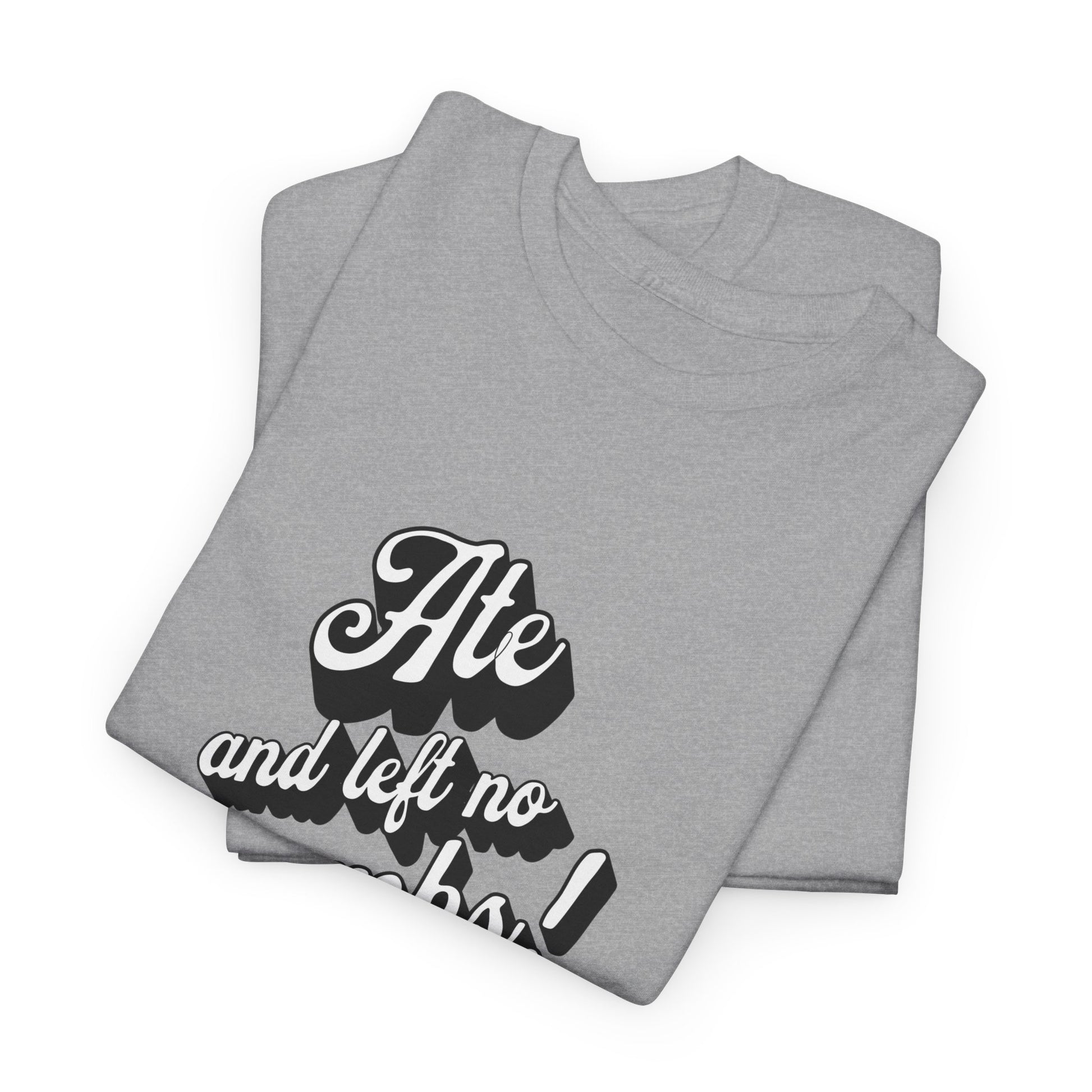This 'Ate And Left No Crumbs' tee exudes a playful and carefree vibe, perfect for those who love quirky humor. It's ideal for casual wear and can be styled for everyday occasions. This tee is relevant for food lovers, humor enthusiasts, and those looking for a fun conversation starter. Perfect for gifts during birthdays, holidays, or just to add a touch of humor to someone's wardrobe.
