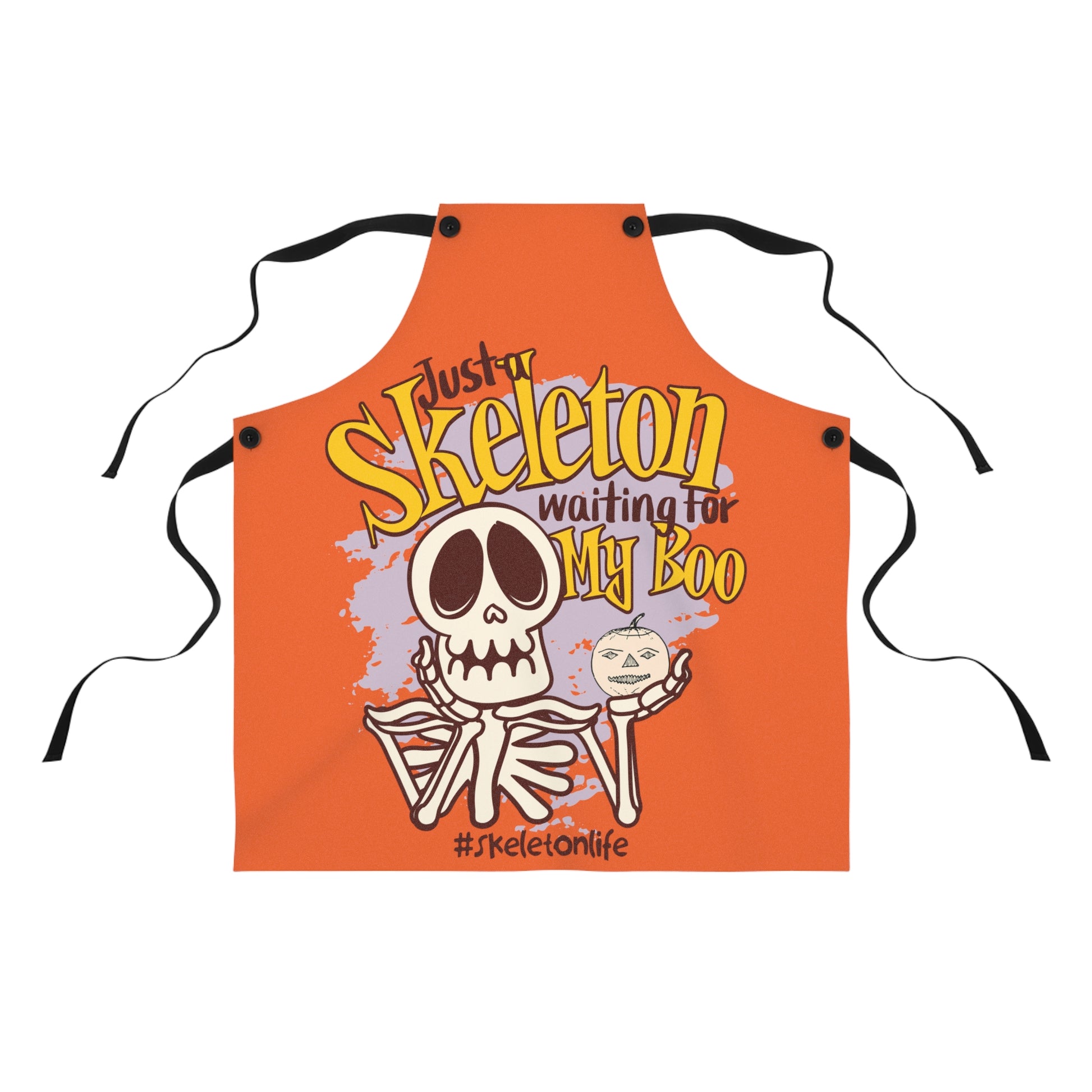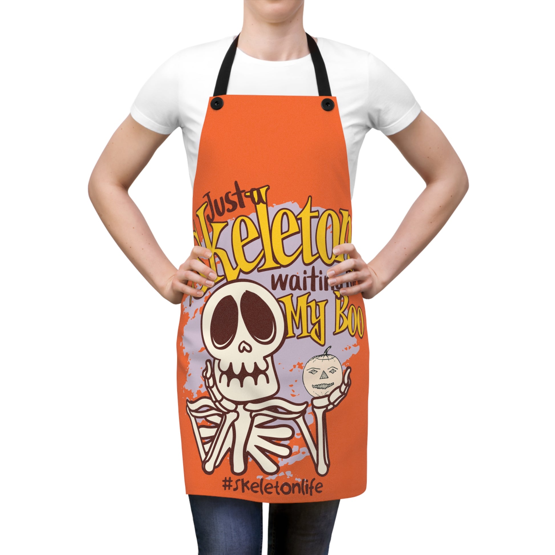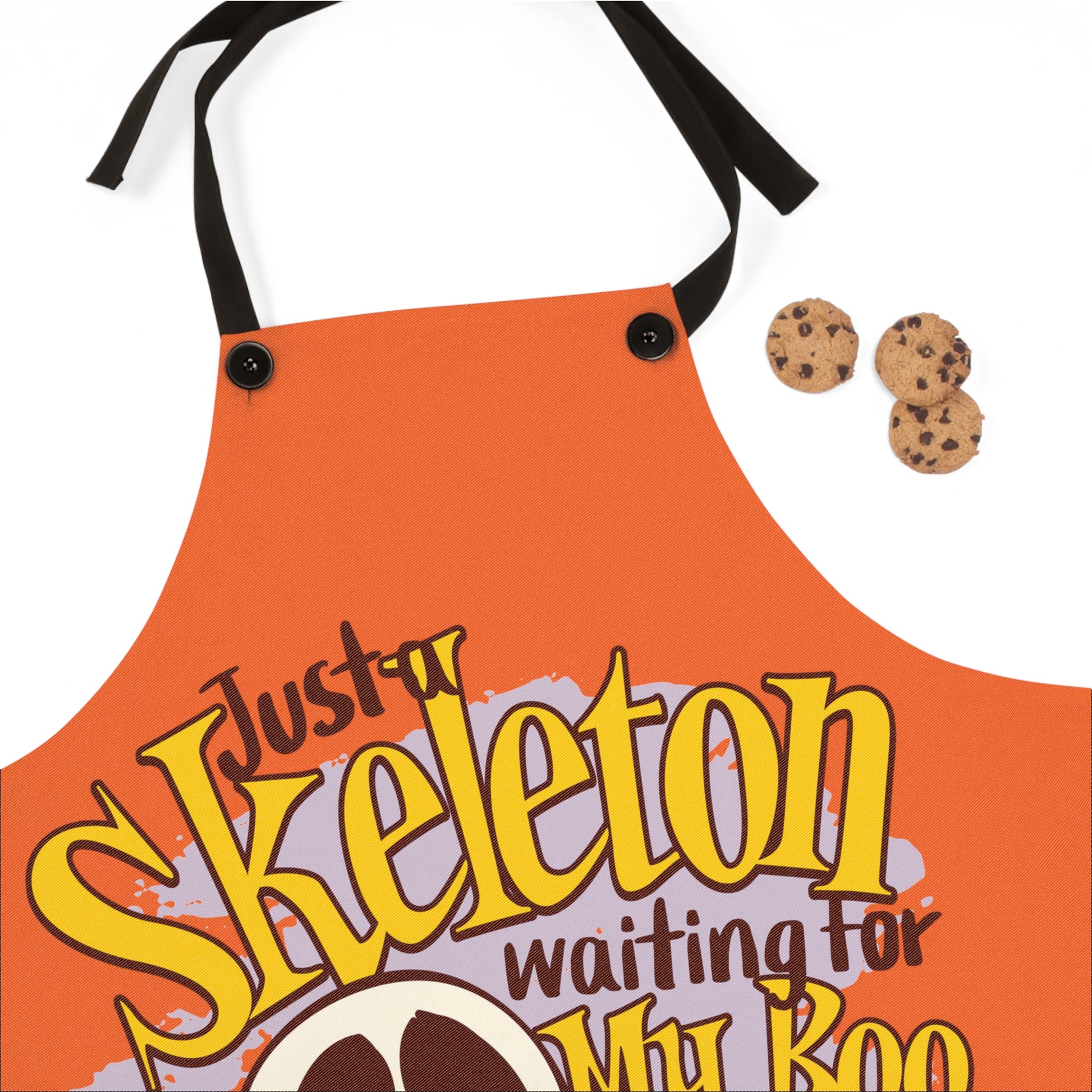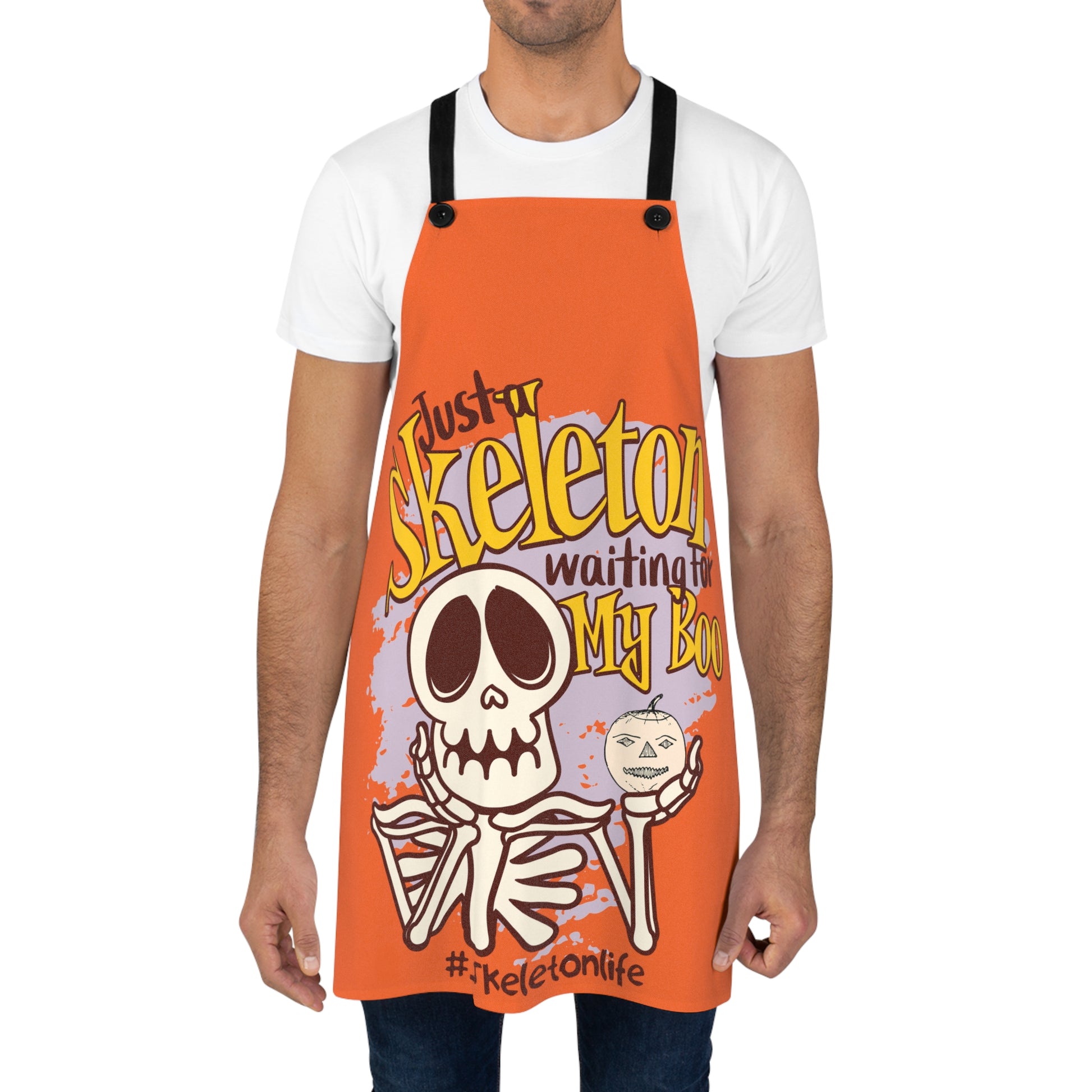 Spooky Halloween Skeleton cooking apron perfect for adding a festive touch to your kitchen. Made of 100% Polyester for durability and quick drying. Features black detachable twill straps and overlocked seams for strength and long-lasting wear. Ideal for Halloween parties and cooking enthusiasts.